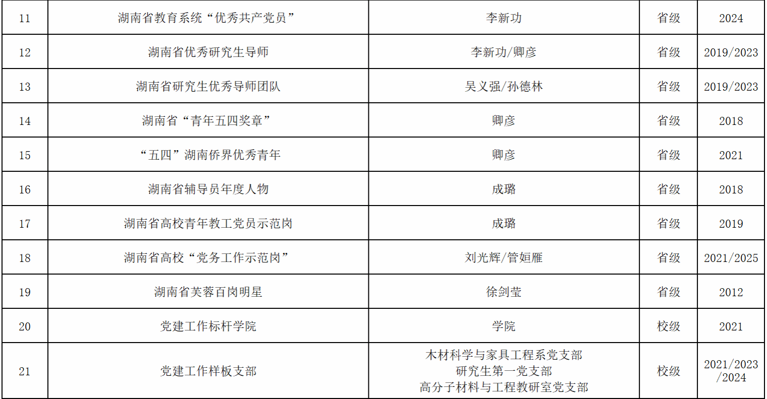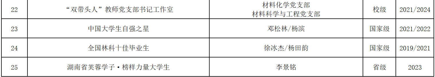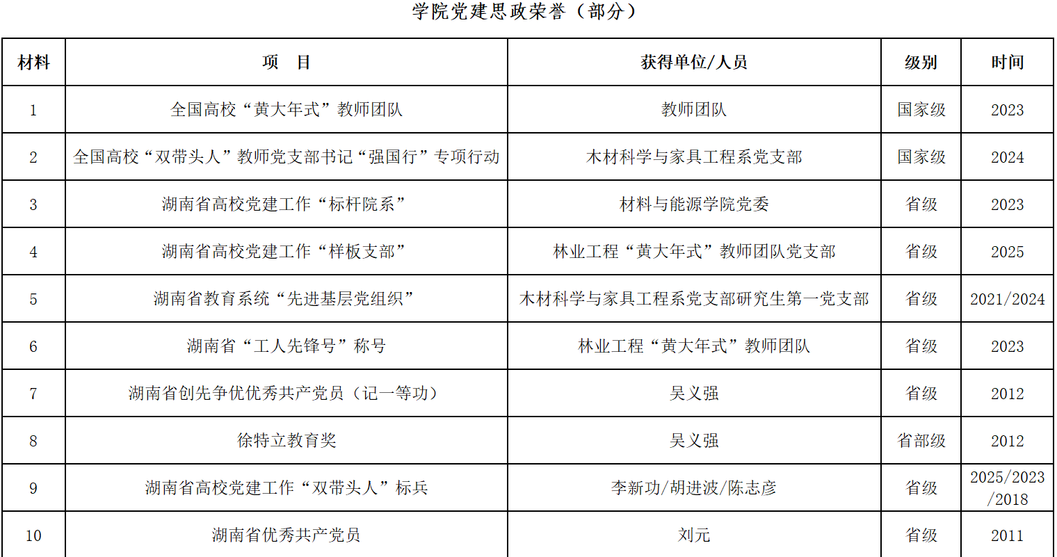 近年来,学院入选教育部高校“双带头人”教师党支部书记“强国行”专项行动,获评湖南省普通高校党建工作标杆院系、样板支部、先进基层党组织等荣誉10余项;学院团队、师生党员获评全国高校黄大年式教师团队、全国创新争先奖、何梁何利基金科学与技术进步奖、海峡两岸林业敬业奖、湖南省“工人先锋号”、湖南省“五一劳动奖章”、湖南省高校党建工作样板支部、“双带头人”标兵、党务工作示范岗等荣誉30余项;学院承担教育部人文社科项目、湖南高校思想政治工作重大攻关项目、湖南省教育厅科学规划重点项目等党建、思政研究项目30余项;学生连续多年获评中国大学生自强之星、湖南省百佳大学生党员、全国林科十佳毕业生等荣誉100余项。