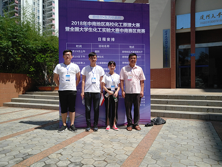 2018年7月19日-21日,第二届中南地区高校化工原理大赛暨全国大学生化工实验大赛中南赛区竞赛在厦门大学举行。经过三轮激烈角逐,我校材料科学与工程学院旷春桃、杨国恩两位老师指导的林化、化工专业参赛队伍CSUFT队(彭媚、彭传冲、陈鹏)荣获中南赛区三等奖。