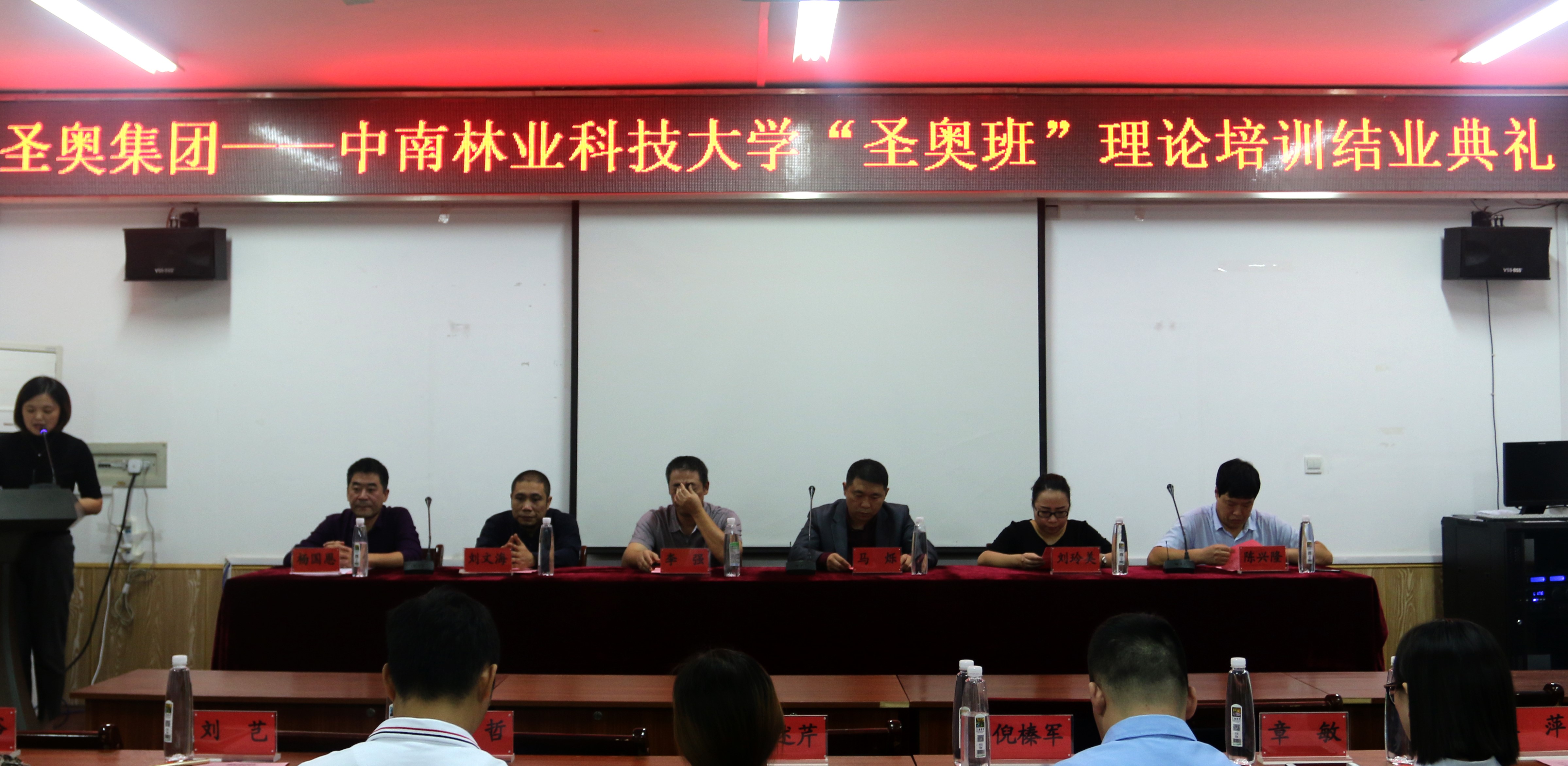 9月28日晚,圣奥集团—中南林业科技大学“圣奥班”理论培训结业典礼于逸夫楼540举行。参加本次典礼的有圣奥集团总监马烁、总监刘玲美、经理陈兴隆、材料科学与工程学院党委书记李强、副院长杨国恩,家具与艺术设计学院副院长刘文海,参加本次典礼的还有材料科学与工程学院和家具与艺术设计学院部分教职工以及“圣奥班”全体学生,本次典礼由杨国恩主持。