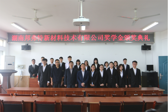 4月11日上午,“邦弗特奖学金”颁奖典礼在逸夫楼540举行。湖南邦弗特新材料技术有限公司董事长李新雄,公司人资行政部经理刘度林,公司市场策划专员吴姝云,院长李贤军参加了颁奖典礼。典礼由院党委副书记莫家明主持。