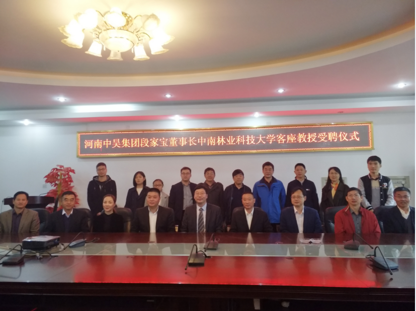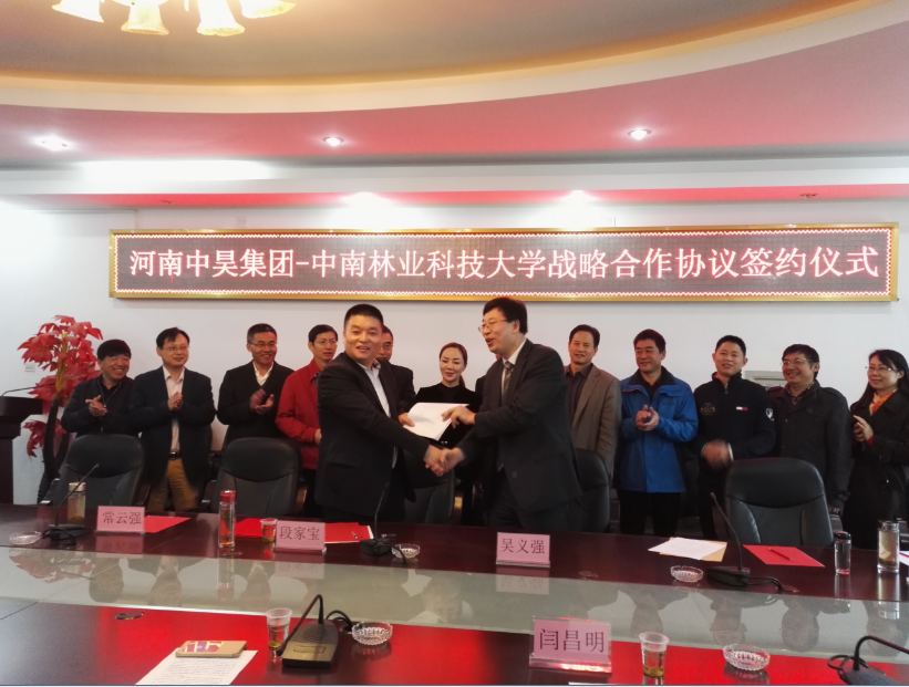 2017年11月12日,中南林业科技大学-河南中昊集团签署战略合作协议和河南中昊集团董事长段家宝客座教授受聘仪式在我院举行。河南中昊集团董事长段家宝、中南林业科技大学吴义强副校长、材料科学与工程学院李贤军院长、人事处主持工作的闫昌明副处长以及学院其它班子成员和部分教师代表共计20人出席了会议,仪式由材料学院袁光明副院长主持。