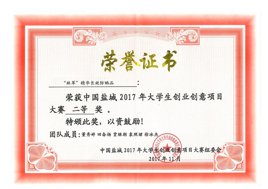11月30日,我院学生董秀婷和田奋扬作为“林萃精华长效防晒乳”项目代表参加中国盐城2017年大学生创业创意大赛总决赛。该参赛项目在总决赛的25个创意组项目中脱颖而出,夺得二等奖。本次比赛在江苏省盐城师范学院举行,由盐城市人力资源和社会保障局、盐城市沿海人才市场主办。