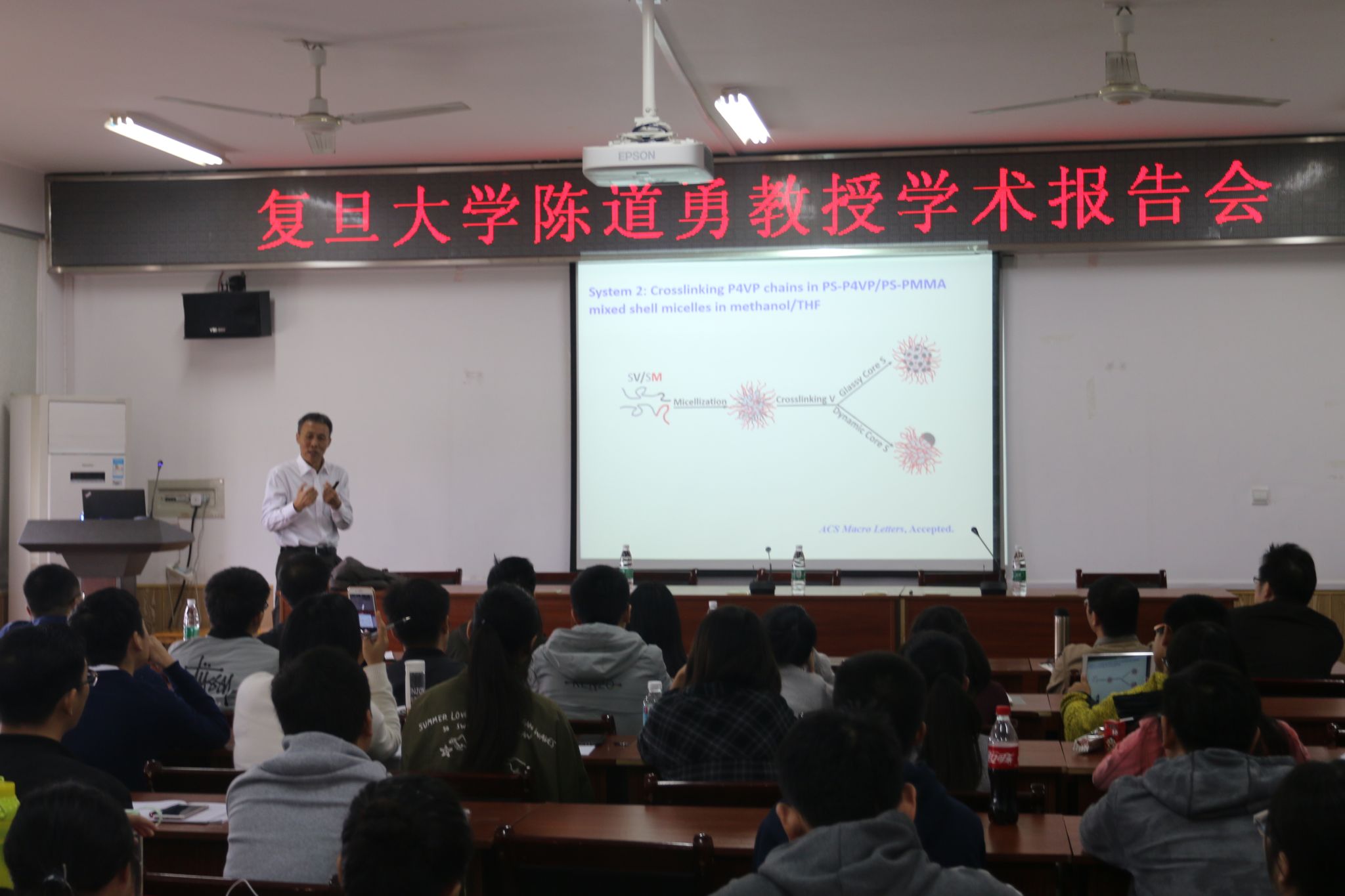 报告会中,陈道勇教授为我们分享了他的学术讲座——大分子的精确组装(不对称模板制备DNA聚合物胶束组装体的方法),他介绍了上述相关领域的研究进展、发展动态以及其本人的研究成果,并进行了互动交流,让同学们开阔了眼界、拓宽了专业知识面,老师们也收获颇多。陈道勇教授对科学研究的热情和深入的思考给全场师生留下了深刻的印象,展示了科学研究的美。