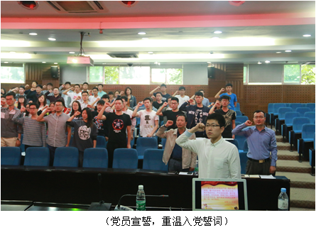 会议在嘹亮的国歌声中拉开了帷幕,随后毕业生党员在叶剑同志的带领下,重温入党誓词。