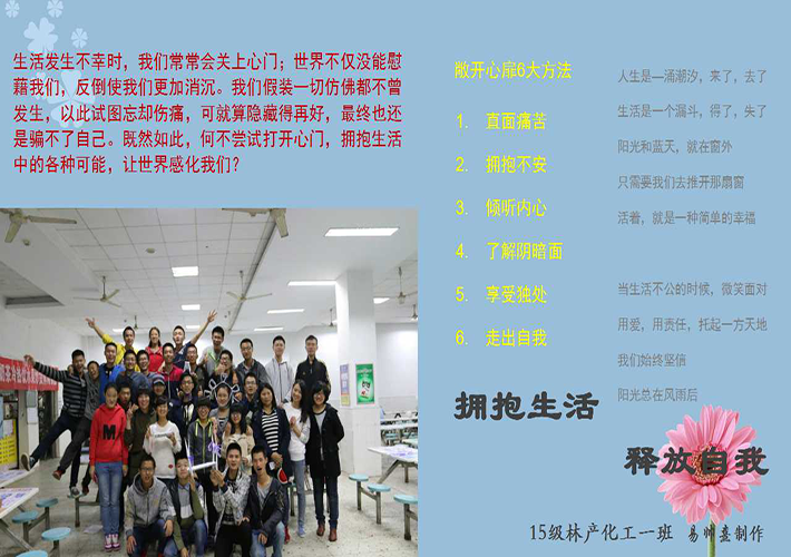 2016年5月,在材料学院团委学生会组织下以班级为单位开展了“拥抱生活,释放自我”主题活动。15级各班通过设计心理活动展板的方式积极参与到了活动中。