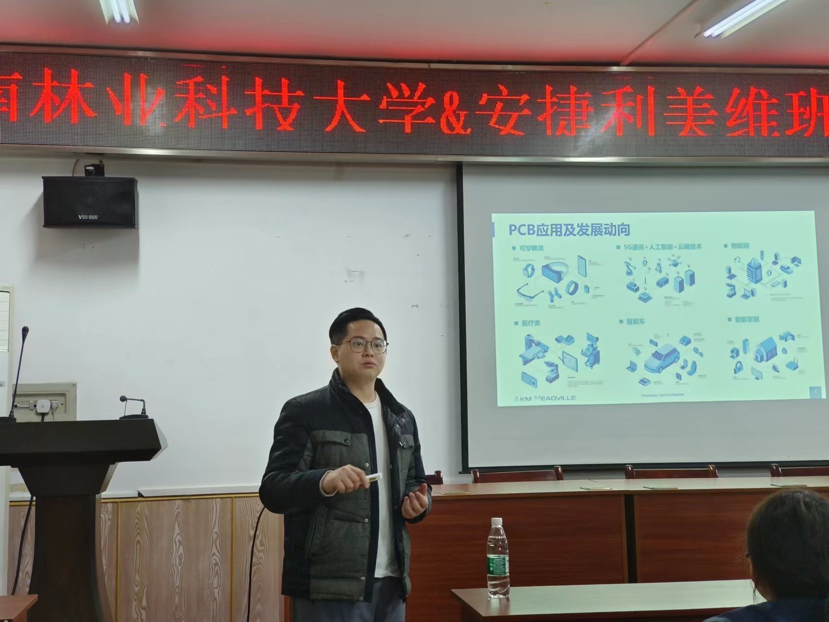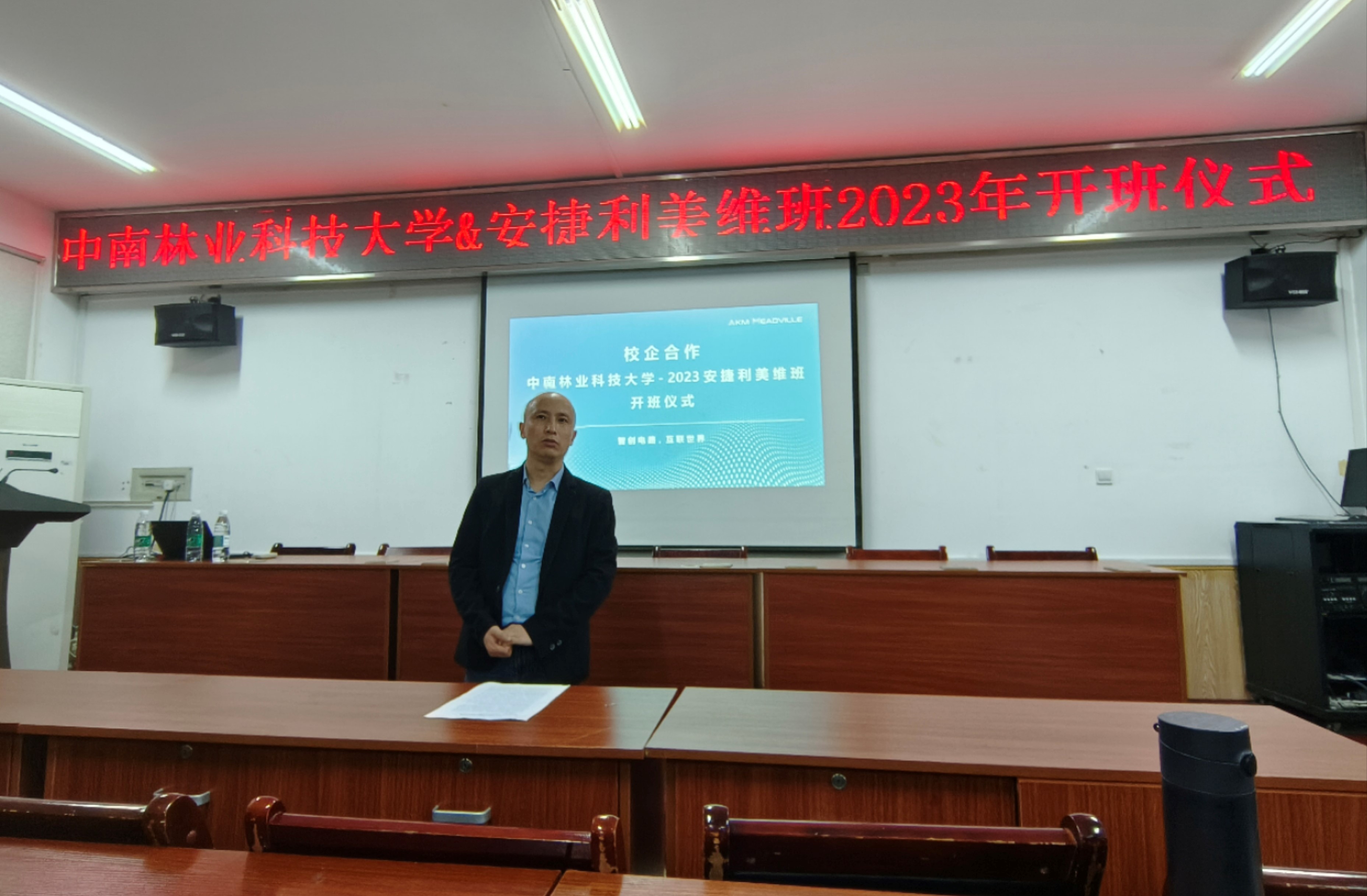 罗振华向与会人员介绍了安捷利美维公司近些年所取得的成绩与未来的发展方向。作为中南林业科技大学校外实习及就业基地,安捷利美维公司将持续为“美维班”学员提供认知实习平台,帮助同学们提前了解企业,感知职场,深化学校的学习和同学们间的情谊。