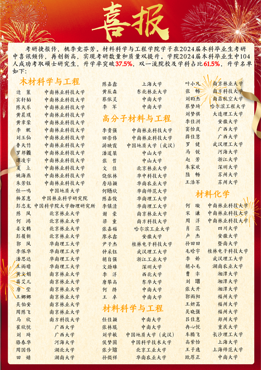 宝剑锋从磨砺出,梅花香自苦寒来。在学院党委的高度重视和全院师生的共同努力下,2024年全国硕士研究生招生考试中我院考研学子喜讯频传。我院2024届本科生考研录取104人,升学率突破37.5%,创历史新高。其中多人被中南林业科技大学、浙江大学、中山大学、哈尔滨工业大学等高校录取,学生考取院校层次和升学质量显著提升。