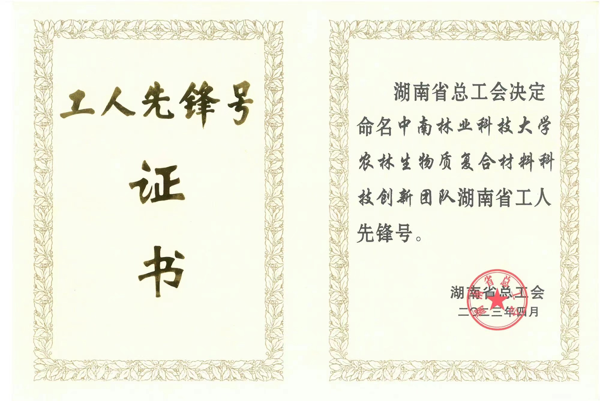 ▲我校农林生物质复合材料科技创新团队被授予2023年“湖南省工人先锋号”荣誉称号