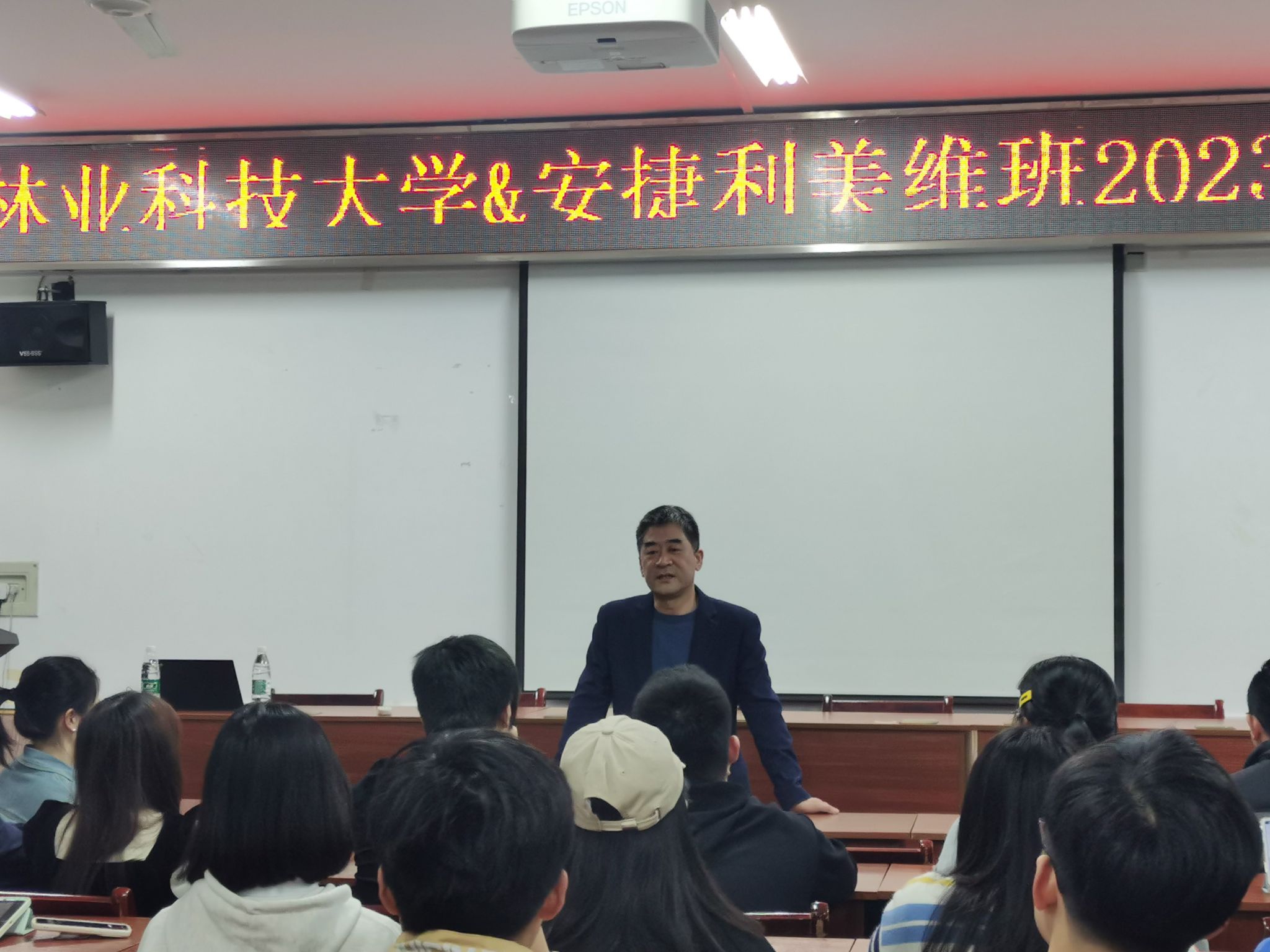 罗振华向与会人员介绍了安捷利美维公司近些年所取得的成绩与未来的发展方向。作为中南林业科技大学校外实习及就业基地,安捷利美维公司将持续为“美维班”学员提供认知实习平台,帮助同学们提前了解企业,感知职场,深化学校的学习和同学们间的情谊。