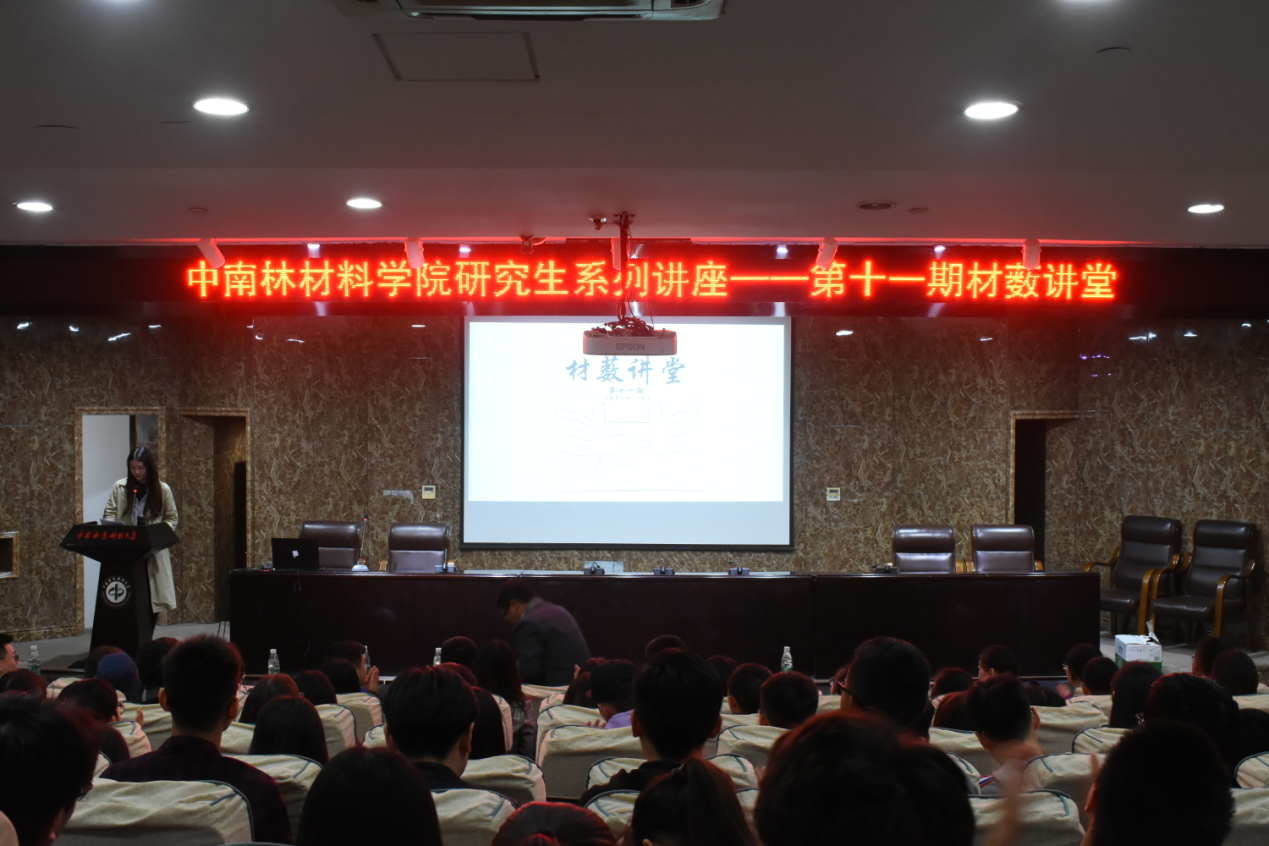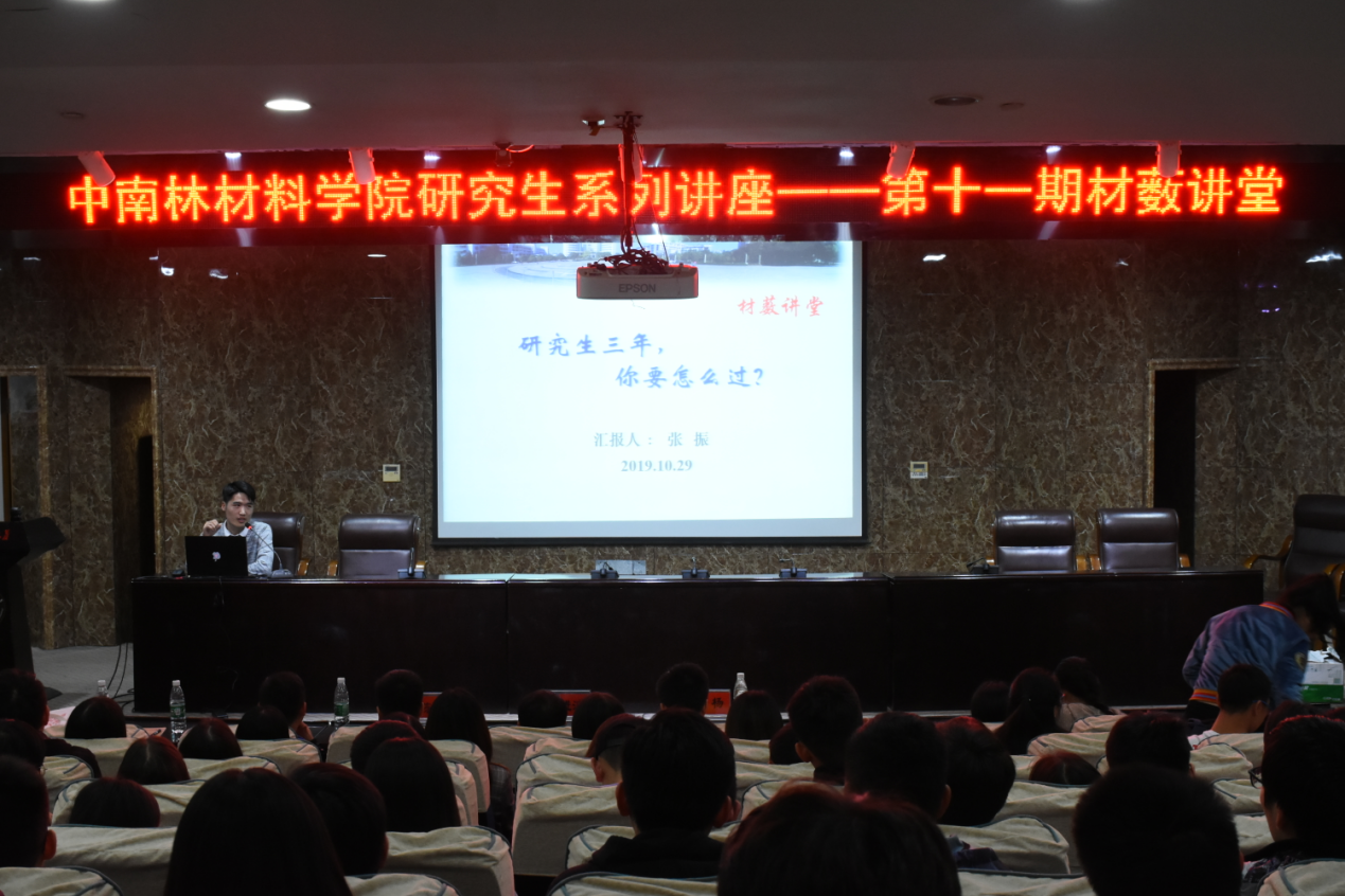 2019年10月29日19:00,由材料科学与工程学院研究生团委学生会与校研究生会学术部共同主办的2019年中南林材料学院研究生系列讲座——第十一期材薮讲堂于图书馆报告厅顺利举行。2019级材料科学与工程学院博士张振和商学院农村与区域发展专业2017级优秀硕士研究生王诗涵受邀作为主讲人参与分享。材料学院胡进波副教授作为特邀点评嘉宾参加此次活动。参加此次活动的老师还有研究生工作部黄杨老师、商学院研究生辅导员陈敬高老师、材料科学与工程学院研究生辅导员方青。300余名在校研究生参与了此次材薮讲堂。