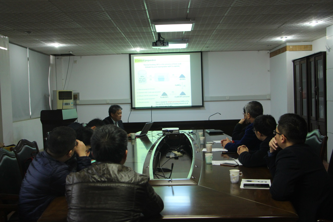 报告会上,椿范立教授以”乙醇的新合成方法”为主题,介绍了“Synergistic Effect of a Boron-Doped Carbon-Nanotube-Supported Cu Catalyst for Selective Hydrogenation of Dimethyl Oxalate to Ethanol”以及“Space-Confined-Self-Regulation Mechanism from Capsule Catalyst to realize an Ethanol Direct Synthesis Strategy”两部分工作,阐明了利用硼掺杂碳纳米管负载铜催化剂对草酸二甲酯选择性加氢制乙醇的协同作用以及胶囊催化剂空间限制的自调控机制来实现乙醇直接合成的研究与应用,对催化剂的制备以及工程中应用的一些问题与现场师生进行了热烈的交流。