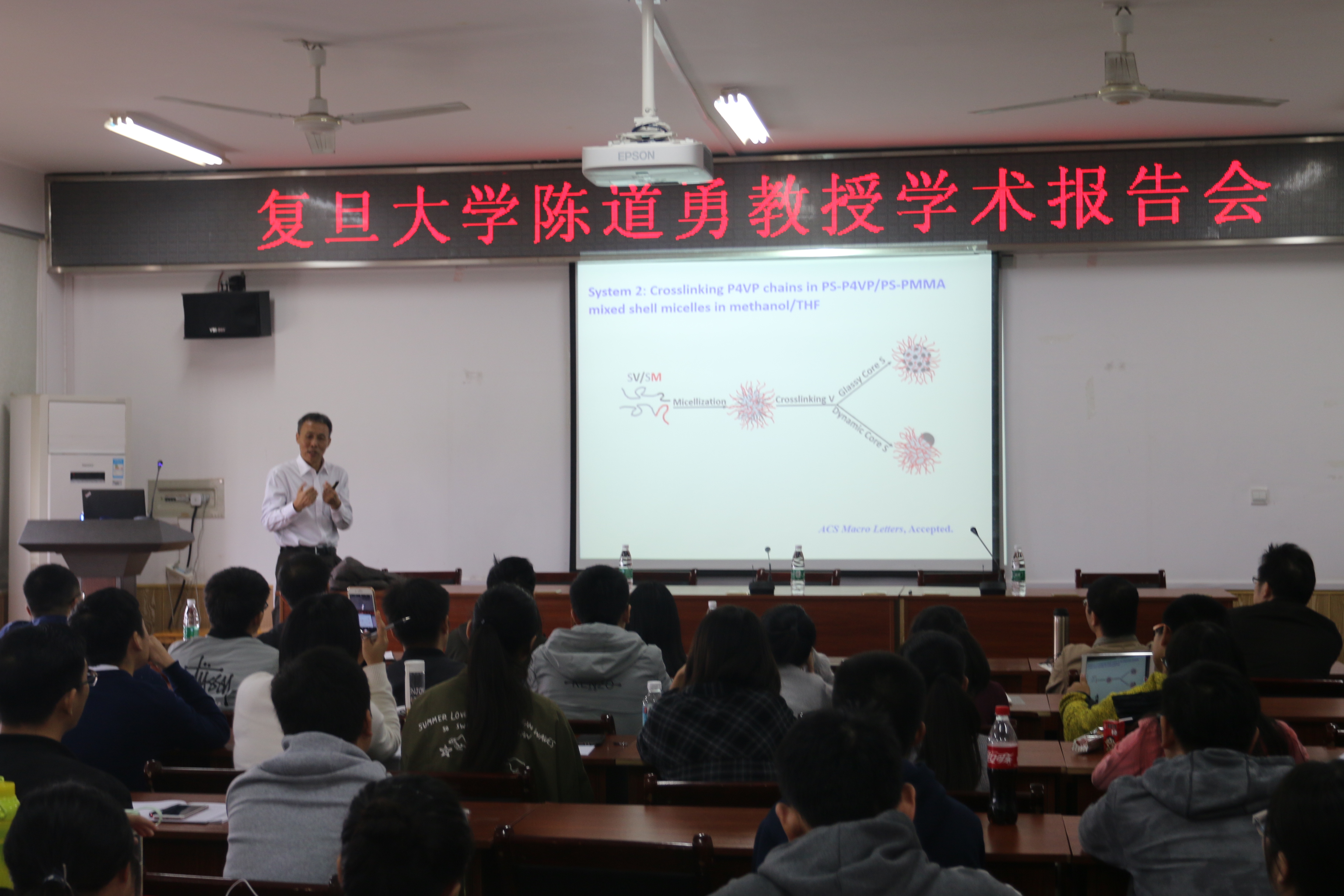 10月21日上午,应学院邀请,复旦大学陈道勇教授在逸夫楼540作了题为“大分子的精确组装(不对称模板制备DNA聚合物胶束组装体的方法)”的学术报告。学院院长李贤军教授主持了报告会。副校长刘元,学院党委书记李强,以及100余教师、硕博士研究生、本科生参加此次报告会。