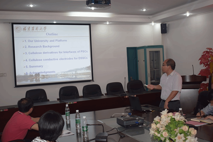 受聘仪式后,欧阳新华教授做了一个精彩的讲座报告,他就近年来在有机太阳能电池电极及电极修饰层材料方面开展的研究工作,重点介绍了纤维素基材料在有机太阳能电池电极及其界面修饰层中的应用,报告结束后与我院师生进行了广泛、积极交流,讲座报告会取得圆满成功。