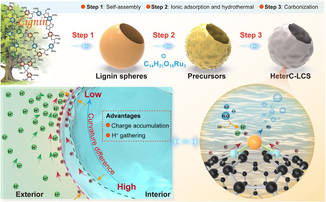 研究针对电催化剂电化学活性位点稀缺及电化学动力学缓慢的难题,提出了一种连续非均质曲率结构木质素基碳纳米反应器。该反应器兼具了尖端纳米曲率效应与连续均质纳米曲率效应双重优势,仅需9.2毫伏的过电势就能实现10毫安/平方厘米的电催化电流,同时实现了超600h的稳定安培级电流电解水析氢。其主要创新点包括:通过电催化剂结构设计,融合尖端效应与均质纳米曲率双重特点,构建电化学活性高、催化动力学迅速的连续非均质曲率结构电催化剂;通过有限元模拟和第一性原理深入阐明了纳米反应器的催化反应机制。这种高性能优势催化剂为木质素等农林生物质资源高值利用、工业电解水、多元化高性能催化剂开发等提供了新思路。