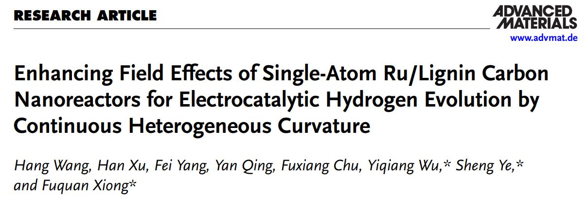 近日,我院吴义强院士团队在林木生物质资源高值化利用方面取得突破性进展,成功构建“木质素基单原子电催化剂”,实现了低电压驱动高电流与快速电化学动力学的技术突破。相关研究成果以《通过连续非均质曲率增强单原子钌/木质素碳纳米反应器的局域电场以促进电催化析氢反应》(Enhancing Field Effects of Single-Atom Ru/Lignin Carbon Nanoreactors for Electrocatalytic Hydrogen Evolution by Continuous Heterogeneous Curvature)为题,发表于国际材料学顶刊《Advanced Materials》(先进材料,AM,中科院1区Top,最新影响因子为26.8,五年影响因子为28.9)。